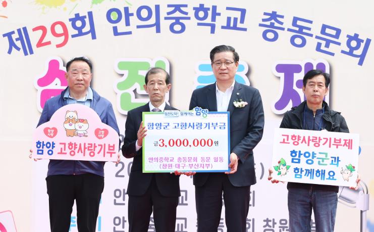 [무한뉴스=최진수 기자] 함양 안의중학교 총동문회는 지난 4월 19일 오전, 안의중학교 운동장에서 열린 ‘제29회 총동문회(심진축제)’ 개회식에서 고향 함양의 발전을 염원하며 고향사랑기부금 300만 원을 기탁했다.