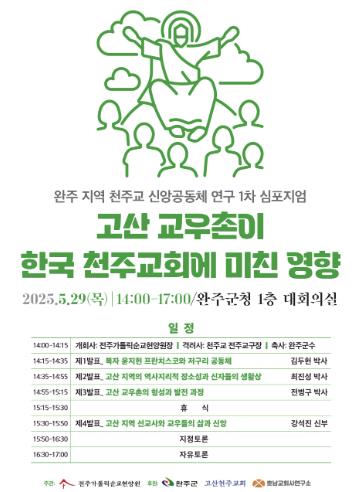 오는 29일 오후 2시부터 5시까지 완주군청 1층 대회의실에서 ‘고산 교우촌이 한국 천주교회에 미친 영향’을 주제로 학술세미나가 개최된다.