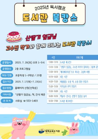 [무한뉴스=정민정 기자] 태백교육도서관은 오는 7월 26일 여름방학을 맞아 초등학교 1~3학년 25명을 대상으로 2025년 독서캠프 ‘도서관 북캉스’를 운영한다.