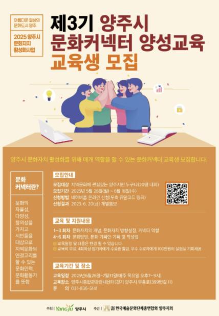 교육은 한국예술문화단체총연합회 양주지회(회장 서순오) 주관으로 진행되며, 문화기획에 관심 있는 시민 20명 내외를 모집한다. 신청은 네이버 폼을 통해 온라인으로 접수하면 된다.