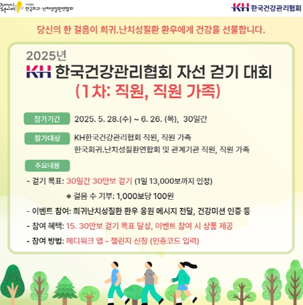[무한뉴스=정승훈 기자] KH한국건강관리협회(회장 김인원)는 전 직원과 가족들이 함께 참여하는 '2025년 KH한국건강관리협회 자선 걷기대회(1차: 직원, 직원가족)'를 오는 5월 28일부터 6월 26일까지 30일간 개최한다고 밝혔다.