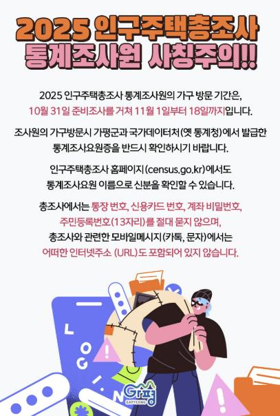 [무한뉴스=정승훈 기자] 가평군은 국가데이터처(옛 통계청)가 주관하는 ‘2025 인구주택총조사’가 진행됨에 따라, 조사원을 사칭한 보이스피싱 및 개인정보 유출 피해에 대한 각별한 주의를 당부했다.