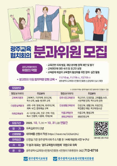 [무한뉴스=정승훈 기자] 광주시교육청시민협치진흥원이 ‘광주교육협치회의 2기 분과위원’을 공개모집한다.