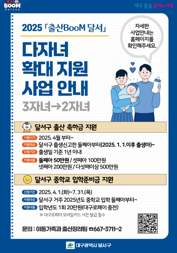 [무한뉴스=최진수 기자] 대구 달서구는 초저출산 위기의 전략적 대응을 위한 '출산BooM 달서' 프로젝트 일환인 다자녀 지원사업을 대폭 확대하여, 출산축하금과 중학생 입학준비금 지원 대상을 4월부터 둘째아로 확대 시행한다.