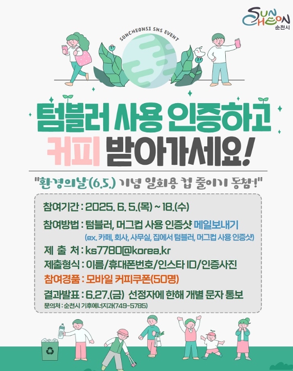 [무한뉴스=정민정 기자] 순천시는 제53회 환경의 날(6. 5.)을 맞아 기후변화 대응과 탄소중립 실천문화 확산을 위해 일회용 컵 줄이기 SNS 이벤트를 오는 18일까지 진행한다고 밝혔다.