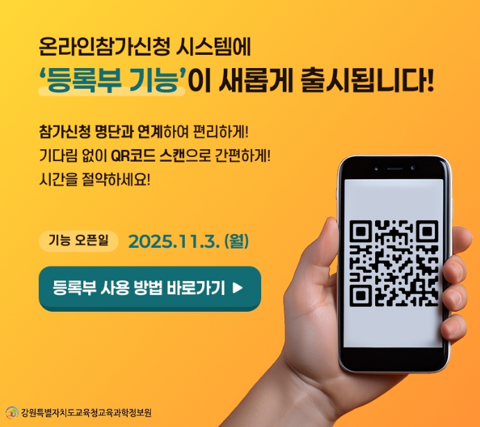 [무한뉴스=정민정 기자] 강원특별자치도교육청교육과학정보원은 ‘2025년 교육포털 시스템 유지관리 사업’의 일환으로, 교육행사 등록 절차의 효율화를 위한 ‘온라인 등록부’ 기능을 새롭게 개발·도입했다고 3일(월) 밝혔다.