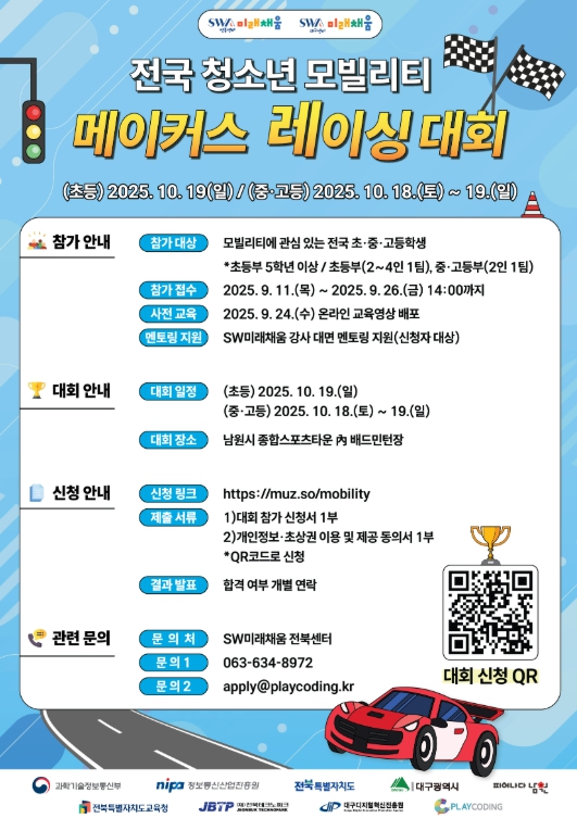 [무한뉴스=정민정 기자] 남원시가 오는 10월 18일부터 19일까지 남원종합스포츠타운 내 배드민턴장에서 ‘SW미래채움(전북) 전국 청소년 모빌리티 메이커스 레이싱 대회’를 개최한다.