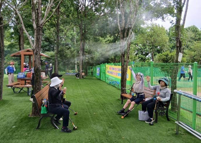 | ▲ 첨단 대상파크골프장에서 쿨링포그를 맞고 있는 동호인들 |