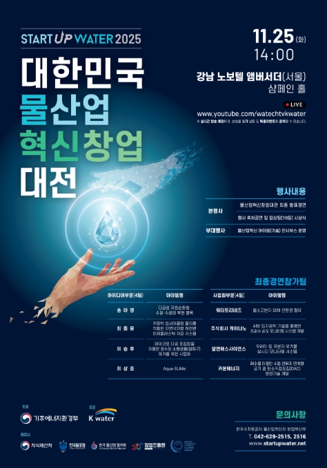 [무한뉴스=최진수 기자] 기후에너지환경부와 한국수자원공사는 물산업을 우리나라의 새로운 성장동력으로 성장시킬 ‘혁신형 고성장 기업(유니콘)’을 발굴하기 위해 11월 25일 노보텔앰버서더호텔(서울 강남구 소재)에서 ‘대한민국 물산업 혁신 창업대전 2025’ 최종 경연을 개최한다고 밝혔다.