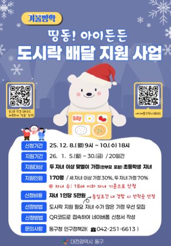 [무한뉴스=정민정 기자] 대전 동구는 방학기간 동안 맞벌이 가정의 양육 공백을 해소하고 초등학생 자녀의 균형 잡힌 식사를 지원하기 위해 ‘겨울방학 띵동! 아이든든 도시락 배달 지원사업’의 신청자를 모집한다고 24일 밝혔다.