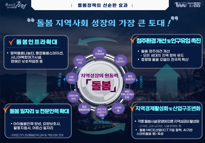 이번 발표는 민선 6기 출범 이후 돌봄을 개인의 영역이 아닌 공적 영역으로 끌어올리고, 돌봄경제 실현을 위해 추진해온 증평군의 노력을 한 단계 더 확장하는 의미를 담고 있다.