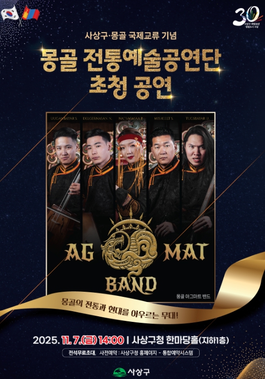 이어 몽골 전통예술공연단 ‘아그마트 밴드’가 약 1시간 30분 동안 몽골의 전통과 현대가 조화를 이루는 무대를 선보인다.