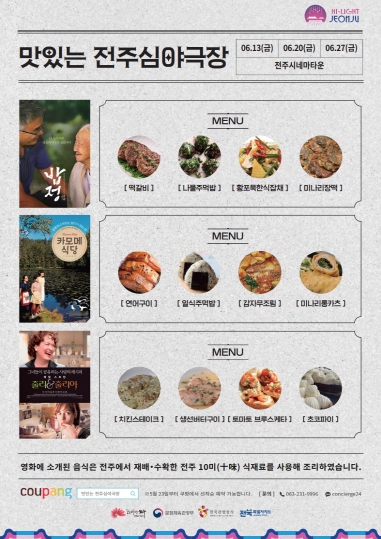 이 프로그램은 음식 관련 영화를 함께 감상하며 지역 셰프가 전주 십미(十味)를 곁들여 조리한 상영작 관련 음식과 음료를 관광객이 직접 맛보고 즐길 수 있는 프로그램으로, △밥정(13일) △카모메 식당(20일) △줄리엔 줄리아(27일) 등의 영화와 영화 속 음식을 만날 수 있다.