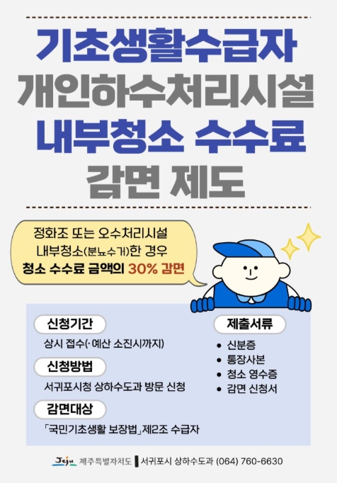 '제주특별자치도 하수도 사용 조례' 제57조에 따라 '국민기초생활 보장법'에 따른 급여 수급자(생계·의료·주거·교육)는 정화조 또는 오수처리시설 내부청소 수수료의 30%를 감면받을 수 있다.