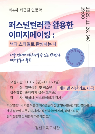 [무한뉴스=정민정 기자] 정선교육도서관은 11월 26일, 고등학생과 일반 성인을 대상으로 제3차 퇴근길 인문학 “퍼스널컬러를 활용한 이미지메이킹 : 색과 스타일로 완성하는 나” 강연을 운영한다.