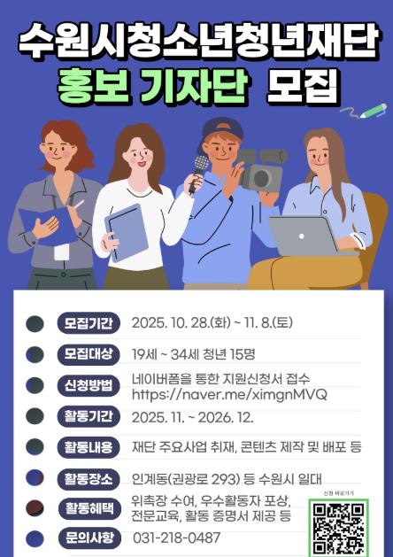 선발된 기자단은 2025년 11월부터 2026년 12월까지 약 1년간 활동하게 되며, 수원시청소년청년재단 부지와 수원시 일대를 중심으로 취재·촬영·콘텐츠 제작 등 다양한 홍보활동을 수행한다.
