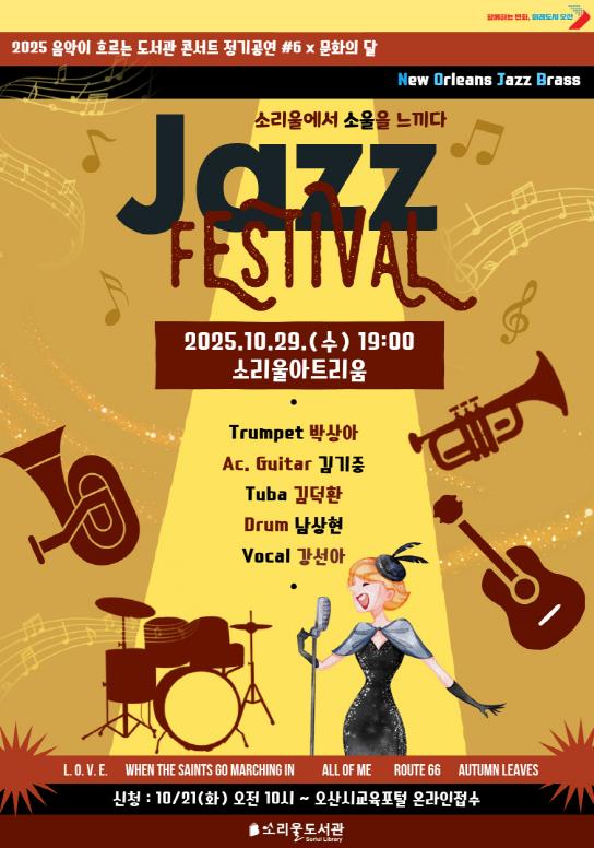 [무한뉴스=정승훈 기자] 경기도 오산시는 오는 10월 29일 오후 7시, 소리울도서관 3층 소리울아트리움에서 '2025 음악이 흐르는 도서관 콘서트 정기공연 #6 × 문화의 달 – Jazz Festival; 소리울에서 소울을 느끼다'를 개최한다고 밝혔다.