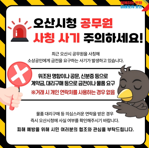 [무한뉴스=정승훈 기자] 오산시는 최근 오산시 공무원을 사칭해 소상공인에게 금품을 요구하는 사기 범죄가 발생함에 따라 시민들에게 각별한 주의를 당부했다.