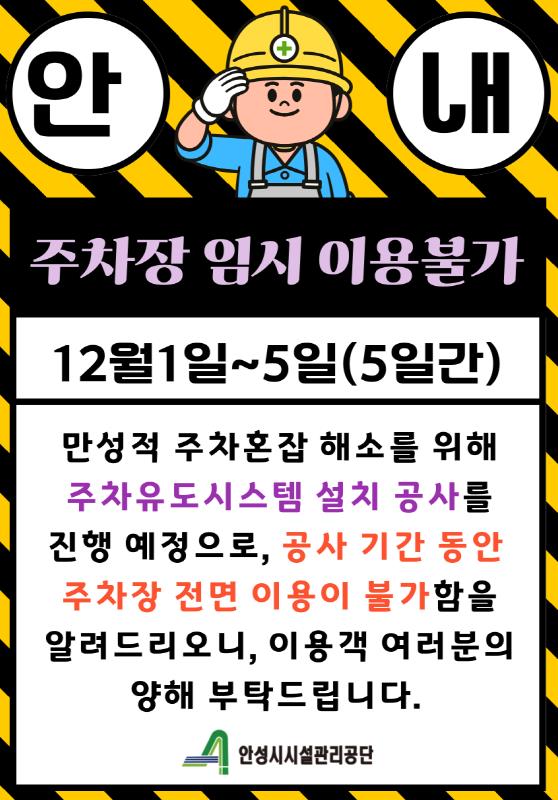 [무한뉴스=정충근 기자] 안성시시설관리공단은 12월 1일부터 5일까지 5일간 석정동 공영주차장 주차유도시스템 설치 공사로 해당 주차장 이용을 한시적으로 중단한다고 밝혔다.
