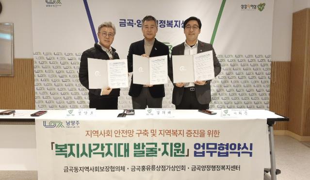 [무한뉴스=정승훈 기자] 남양주시는 15일 금곡양정행정복지센터가 금곡동 지역사회보장협의체 및 금곡홍유릉상점가상인회와 함께 복지사각지대 발굴 및 취약계층 지원 강화를 위한 업무협약(MOU)을 체결했다고 밝혔다.