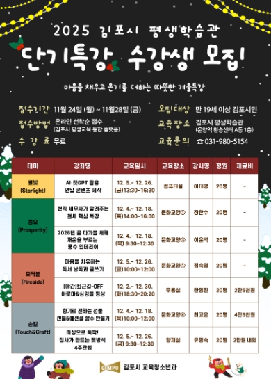 [무한뉴스=정승훈 기자] 김포시는 ‘따뜻한 연말’을 주제로 시민의 정서적 힐링과 실생활에 유용한 학습 기회 제공을 위해, ‘2025년 하반기 평생학습관 단기특강 수강생’을 오는 11월 24일부터 선착순으로 모집한다.