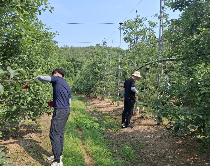 | ▲ 금산군청 도시건축과 공무원들 사과 적과 농촌봉사 모습 |
