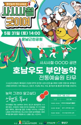 [무한뉴스=정민정 기자] 광주 광산구가 광산농악보존회와 함께 31일 운남근린공원에서 사시사철 굿이여의 두 번째 이야기인 ‘사시사철 GOOD 공연’을 선보인다.