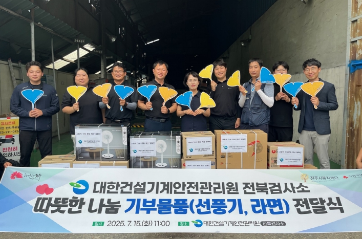 [무한뉴스=정민정 기자] 대한건설기계안전관리원 전북검사소(소장 송명선)는 15일 전주시복지재단(이사장 윤방섭)에 여름철 무더위에 취약한 이웃을 돕기 위한 선풍기와 라면(100만 원 상당)을 기부했다.