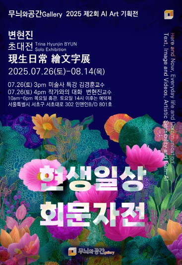[무한뉴스=정민정 기자] AI 아트의 선구자로 손꼽히는 변현진 전남대 문화전문대학원 교수가 7월 26일부터 8월 14일까지 서울 서초구 ‘무늬와 공간 갤러리’에서 AI와 인간의 협업을 실험하는 개인전 ‘현생일상 회문자(現生日常 繪文字)’를 개최한다. ‘무늬와 공간 갤러리 2025 제2회 AI Art 기획전’ 중 하나로 마련된 이번 전시는 생성형 인공지능을 활용한 회화, 사진, 설치, 그래픽 등 다양한 매체가 융합된 작업을 통해 기술과 감각, 인간과 기계의 경계를 허무는 새로운 예술적 실천을 제시한다.