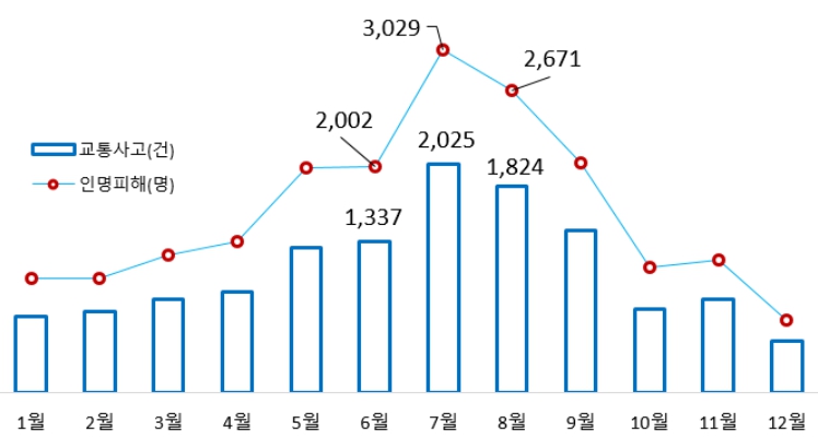 최근 5년(2020~2024년, 평균)간 강수일수를 살펴보면 7월이 15.8일로 한 달의 절반이 넘게 비가 내렸고, 빗길 교통사고도 3,029건으로 가장 많이 발생했다.