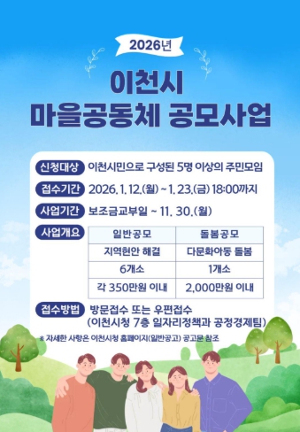 [무한뉴스=정충근 기자] 이천시는 주민이 직접 제안하고 실행하는 공동체 활동을 지원하기 위해 ‘2026년 이천시 마을공동체 공모사업’ 참여 공동체를 모집한다고 밝혔다.