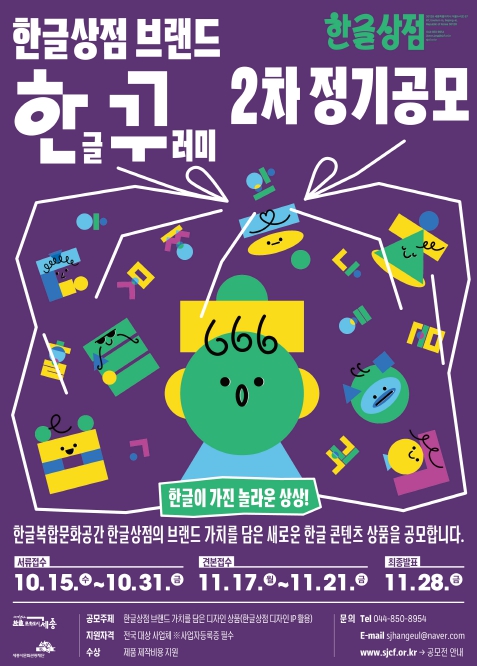[무한뉴스=정민정 기자] 세종시문화관광재단은 한글복합문화공간 한글상점의 글자, 캐릭터를 활용해 한글의 조형적 아름다움을 새롭게 해석하고, 이를 디자인 상품으로 개발하기 위한 ‘한꾸(한글꾸러미)’ 2차 디자인 공모전을 개최한다.