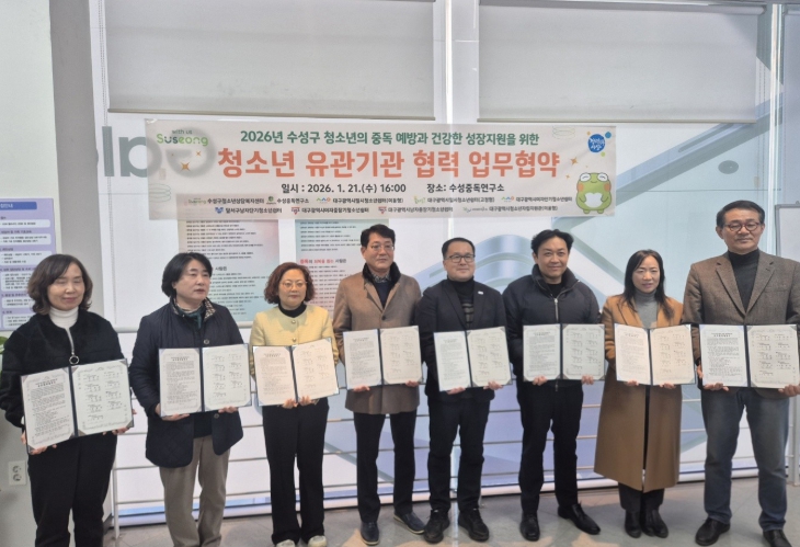김대권 수성구청장은 “청소년 중독 문제는 단일 기관의 노력만으로는 한계가 있는 만큼 지역사회 유관 기관 간 협력이 무엇보다 중요하다”며 “이번 협약을 통해 위기청소년이 적시에 보호받고, 회복과 자립으로 이어질 수 있는 통합적 지원체계를 강화해 나가겠다”고 말했다.