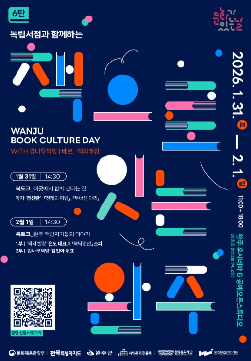[무한뉴스=정민정 기자] 완주문화재단은 오는 1월 31일부터 2월 1일까지 이틀간 완주 휴시네마와 공예오픈스튜디오에서 '문화가 있는 날 6탄 – 책으로 잇는 완주'를 개최한다.