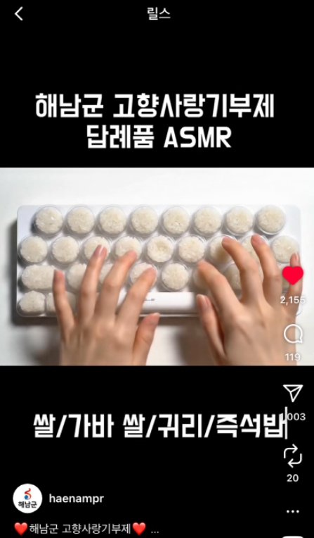 AI 기술을 활용해 제작한‘해남고향사랑기부제 답례품 ASMR’영상은 지난 9일 군 인스타그램 계정에 게재된 후 일주일만에 조회수 30만회를 돌파했다.