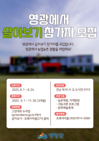 [무한뉴스=정민정 기자] 영광군은 귀농·귀촌을 희망하는 도시민의 안정적인 농촌 정착을 지원하기 위해 '2025년 영광에서 살아보기' 2기 참가자를 모집한다.