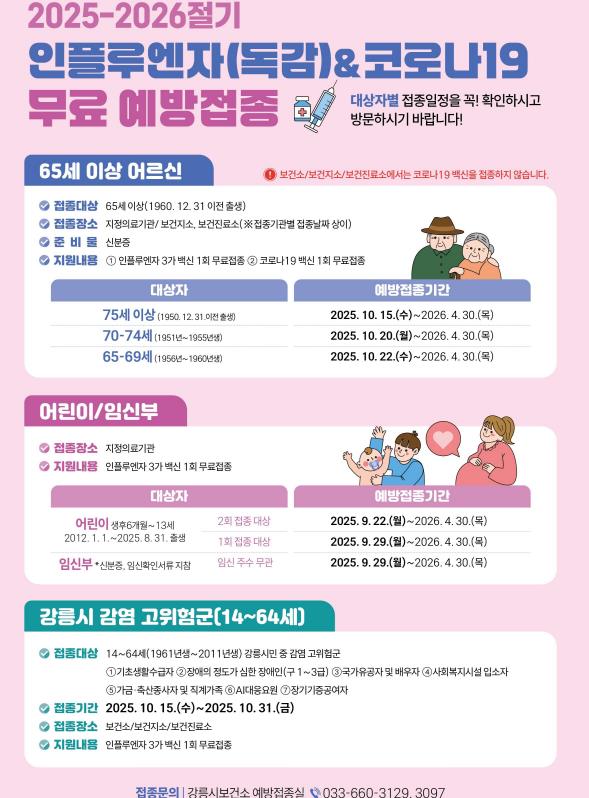 [무한뉴스=정민정 기자] 강릉시는 겨울철 호흡기 감염병 예방을 위해 오는 9월 22일부터 2025-2026절기 독감 및 코로나19 무료 예방접종을 실시한다고 밝혔다.