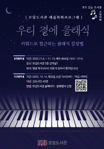[무한뉴스=정승훈 기자] 김포시 모담도서관은 클래식을 주제로 11월 6일부터 13일까지 매주 목요일 오후 7시부터 9시까지 특별 강연을 운영한다.