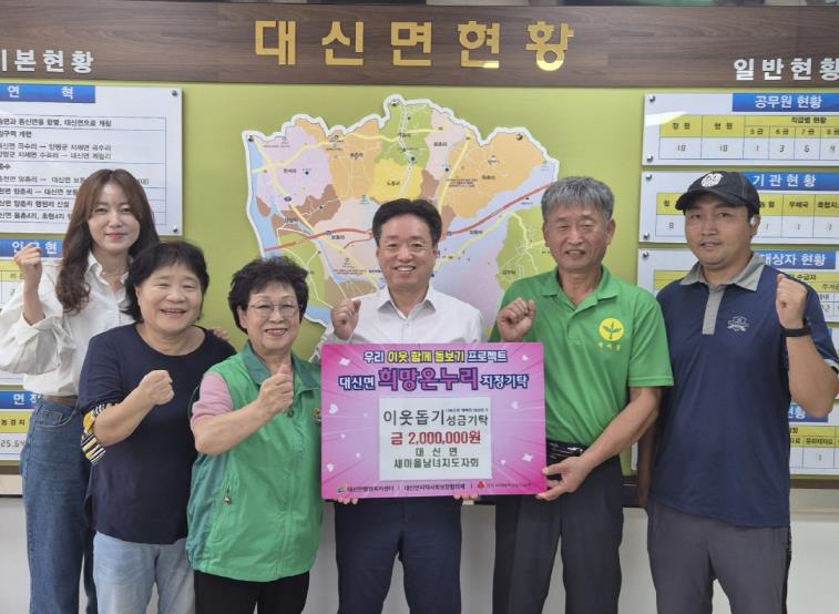 한편 대신면 새마을 남녀지도자회는 반찬 나눔 봉사, 빵 나눔 봉사, 삼계탕 만들기, 고추장 만들기 등 다양한 봉사활동에 적극 참여하고 있으며 면 내 주요 행사에도 빠짐없이 동참하는 등 지역사회를 위한 헌신적인 활동을 지속적으로 이어가고 있다.