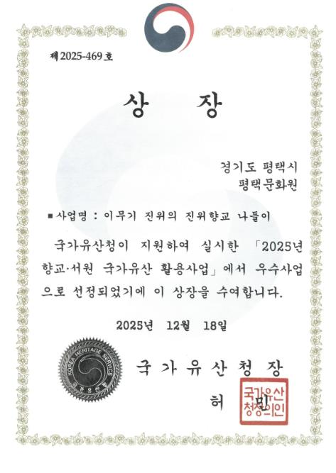 [무한뉴스=정승훈 기자] 평택문화원은 12월 18일 대전 전통나래관 다목적강당에서 열린 국가유산청 주최 ‘2025 우리고장 국가유산 활용 우수사업 시상식’에서 평택문화원의 ‘이무기 진위의 진위향교 나들이’가 우수사업(국가유산청장상)으로 수상했다.
