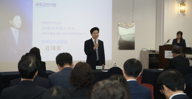 | ▲ 김대중 전라남도교육감이 14일 목포에서 열린 ‘10월 정책협의회’에 앞서 인사말을 전하고 있다. |