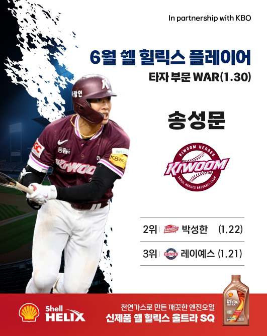 [무한뉴스=최진수 기자] KBO와 한국쉘석유주식회사가 함께 시상하는 ‘쉘힐릭스플레이어’의 2025 신한 SOL뱅크 KBO 리그 6월 수상자로 NC 로건과 키움 송성문이 선정됐다.