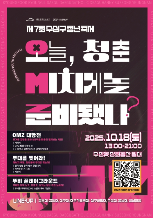 [무한뉴스=최진수 기자] 대구 수성구는 오는 18일 수성못 상화동산 일대에서 ‘2025 제7회 수성구 청년축제’를 개최한다.
