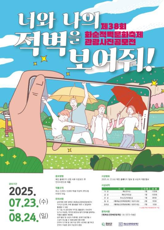 공모 기간은 2025년 7월 23일부터 8월 24일까지이며, 참가 희망자는 (재)화순군문화관광재단 홈페이지 또는 화순군청 홈페이지 공고란에서 참가신청서를 내려받아 작성한 후, 사진 이미지(JPEG 형식, 해상도 2,000×3,000픽셀 이상)와 함께 이메일로 제출하면 된다.