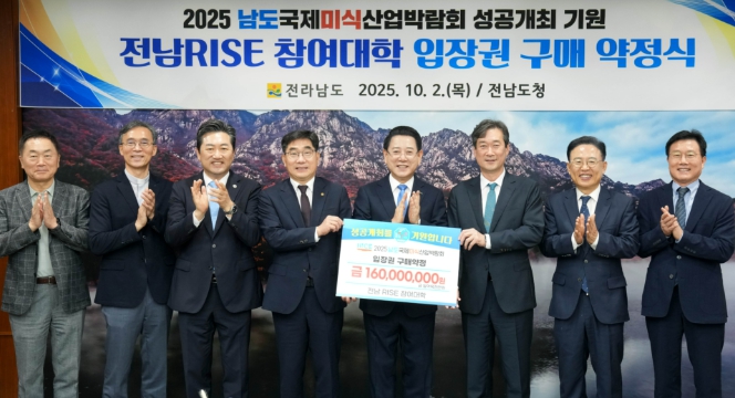[무한뉴스=정민정 기자] 전라남도는 2일 도청 접견실에서 전남RISE 참여대학 총장단과 함께 ‘2025 남도국제미식산업박람회 입장권 구매 약정식’을 개최했다.