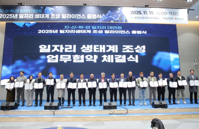 시는 19일 JB연수원 아우름 캠퍼스에서 ‘일자리창출 생태계 조성 얼라이언스’ 출범식을 갖고, 바이오산업 육성을 통한 지역 고용 생태계의 새로운 비전을 선포했다.