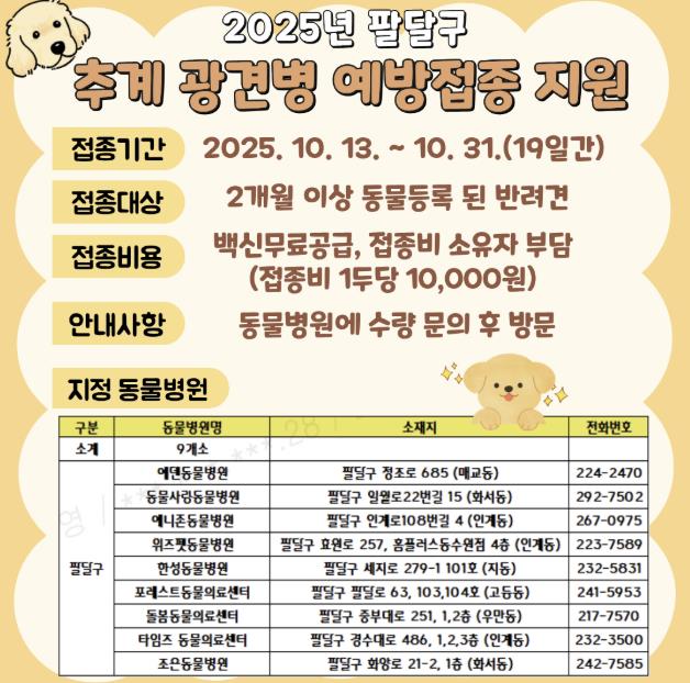 수원시 팔달구는 "소중한 반려견을 지키고, 구민들의 안전을 위해 적극적으로 예방접종에 참여해 주시길 당부드린다“고 말했다.