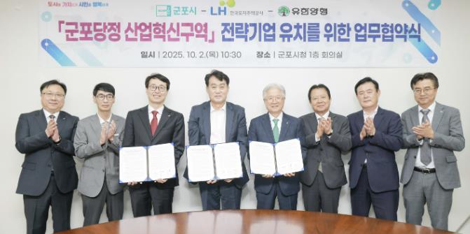 [무한뉴스=손성기 기자] 군포시는 2일 군포시청에서 한국토지주택공사(LH), ㈜유한양행과 ‘군포당정 산업혁신구역’ R·D 전략기업 유치를 위한 업무협약을 체결했다고 밝혔다.