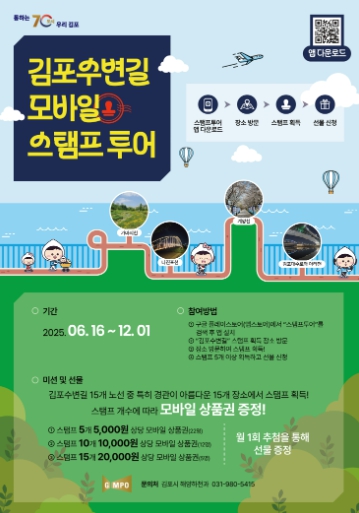 이번 스탬프 투어는 모바일을 활용한 온라인 투어 방식으로, 참가자는 스마트폰에서 ‘스탬프 투어’ 앱을 다운받아 김포수변길 15개 코스에서 지정 장소에 방문하면 위치정보(GPS)를 통해 자동으로 스탬프를 수집하게 된다. 스탬프를 일정 개수 이상 모으면 기념품도 받을 수 있다.