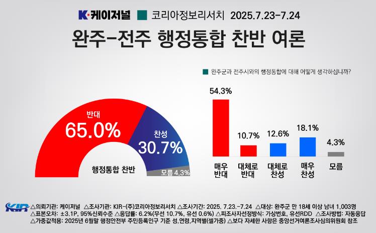 완주군민 1003명이 응답한 해당 여론조사는 완주군민의 65.0%가 전주와의 행정통합에 반대 입장을 나타냈으며, 찬성은 30.7%에 그쳤다.